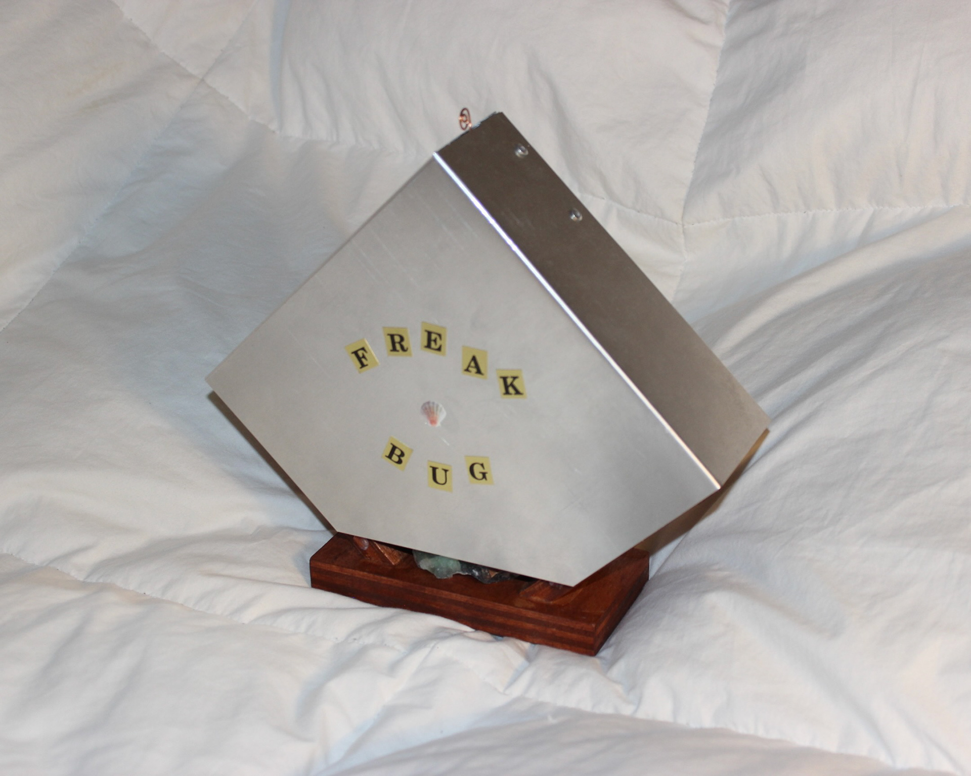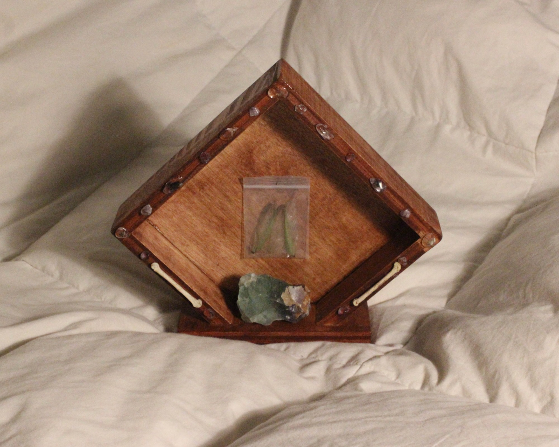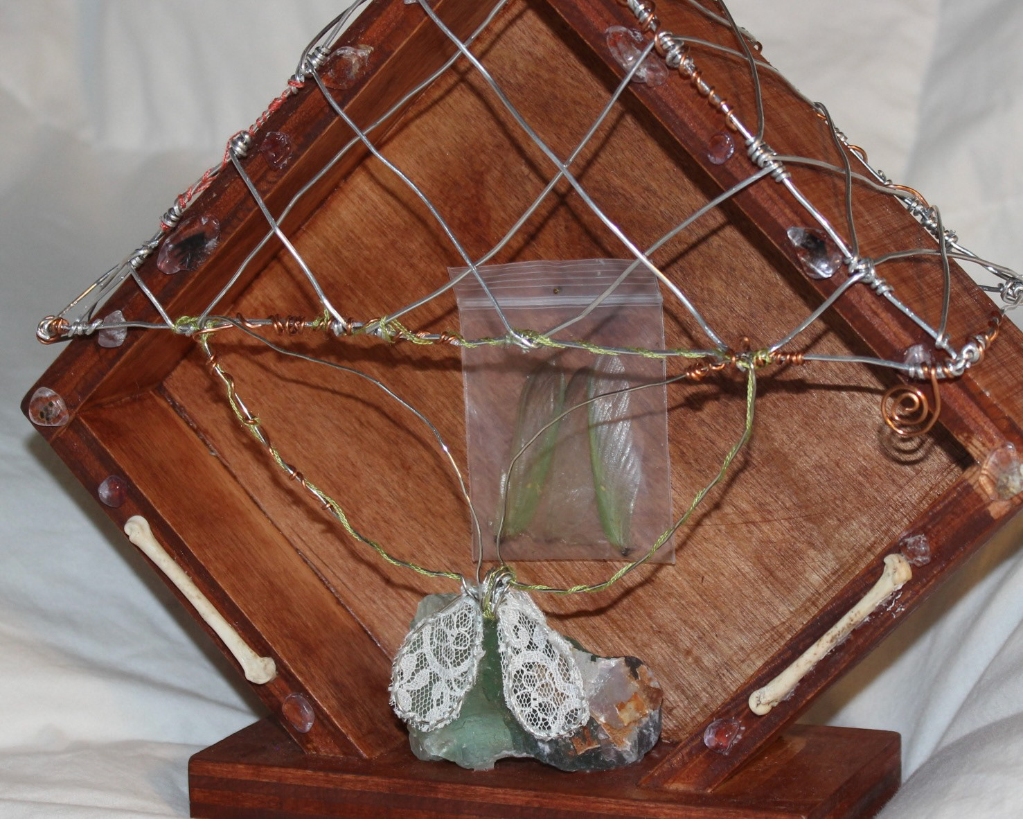 Wood, metal, string, amethyst, fluorite, fox bones, and bug wings (moth, ladybug, and mantid)